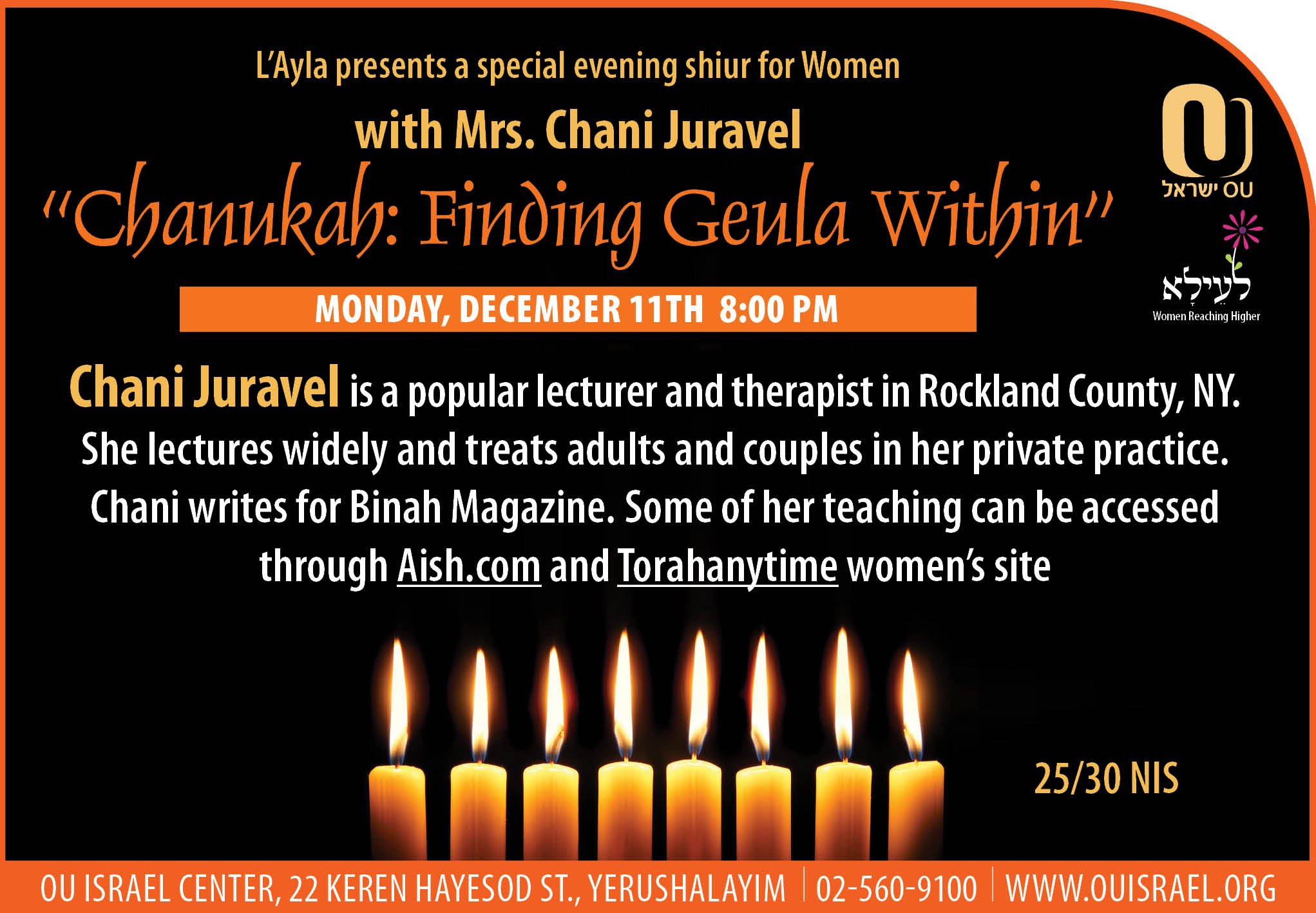 As we approach Chanukah L’Ayla presents a special evening shiur for Women with Mrs. Chani Juravel