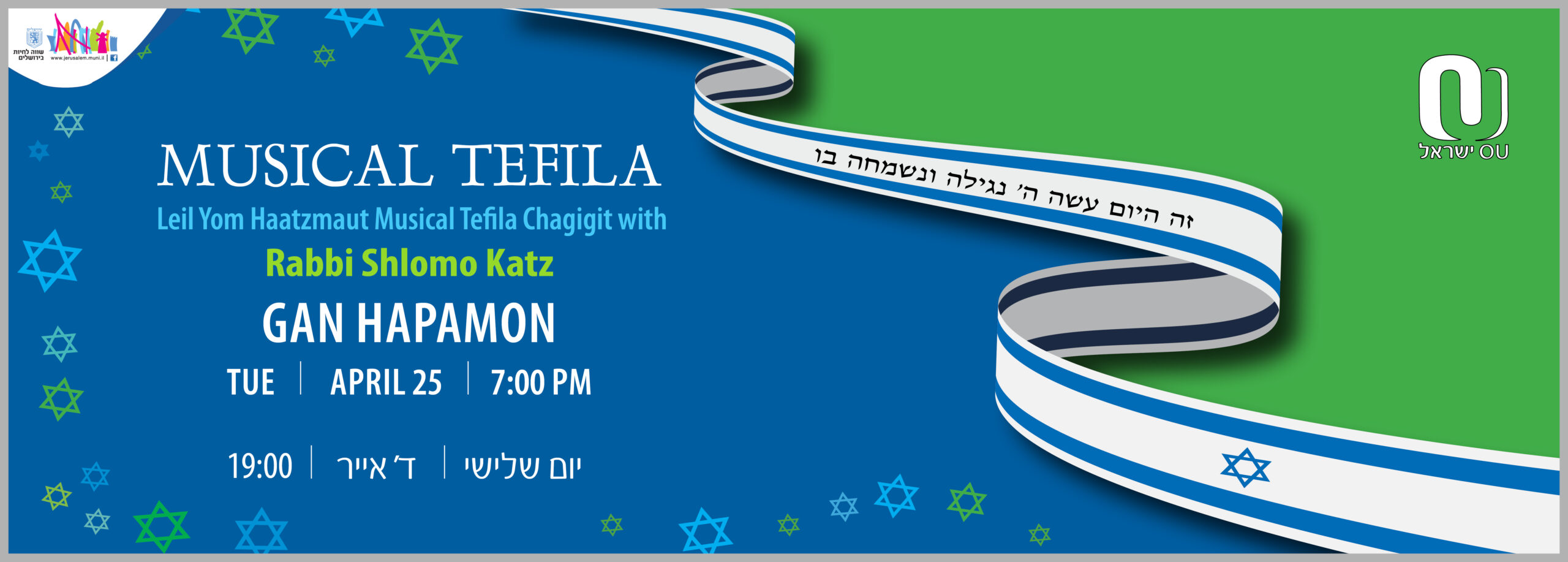 At the end of the walking tour, we will be picked up by bus and taken to Gan HaPaaamon. We will have a falafel picnic in the park and then join the OU Israel Yom Haatzmaut Tefilla Chagigit with Shlomo Katz (see flyer below).