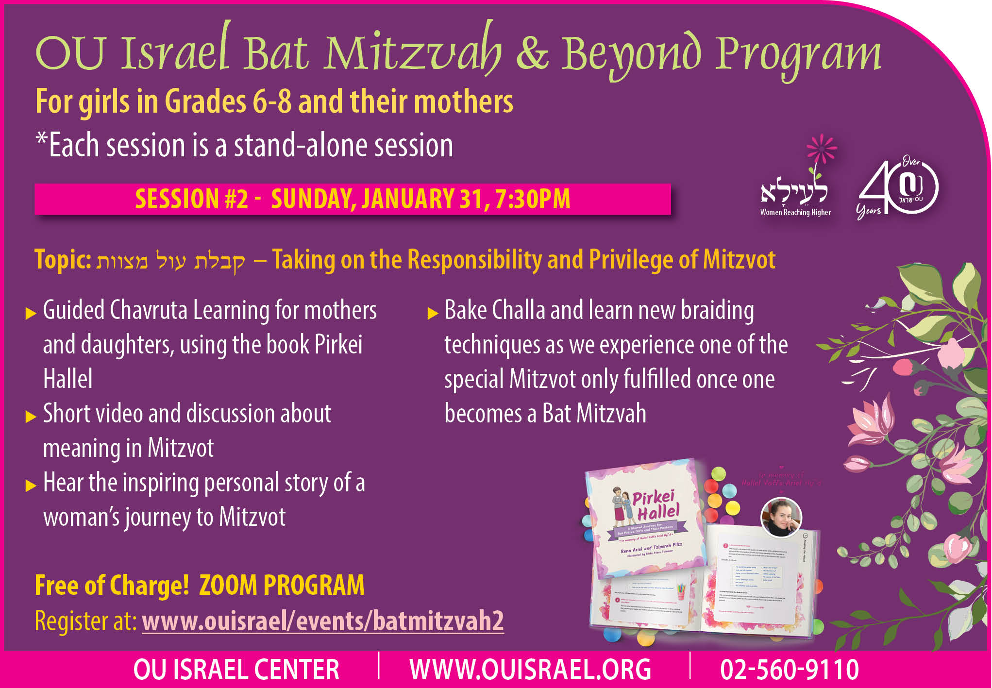 In this session, we will be learning together bchavruta about accepting Mitzvot upon ourselves and what that means practically. Attached is a sourcesheet for you to print out to use at the event. We will also be hearing from Mrs. Cypora Cohen, who will share with us her personal journey to Mitzvot. Finally, we will be making challah dough, doing hafrashat challa (one of the first mitzvot you can only perform once you become a Bat Mitzvah) and learning how to make some cool braids with Mrs. Aviva Dworkin.