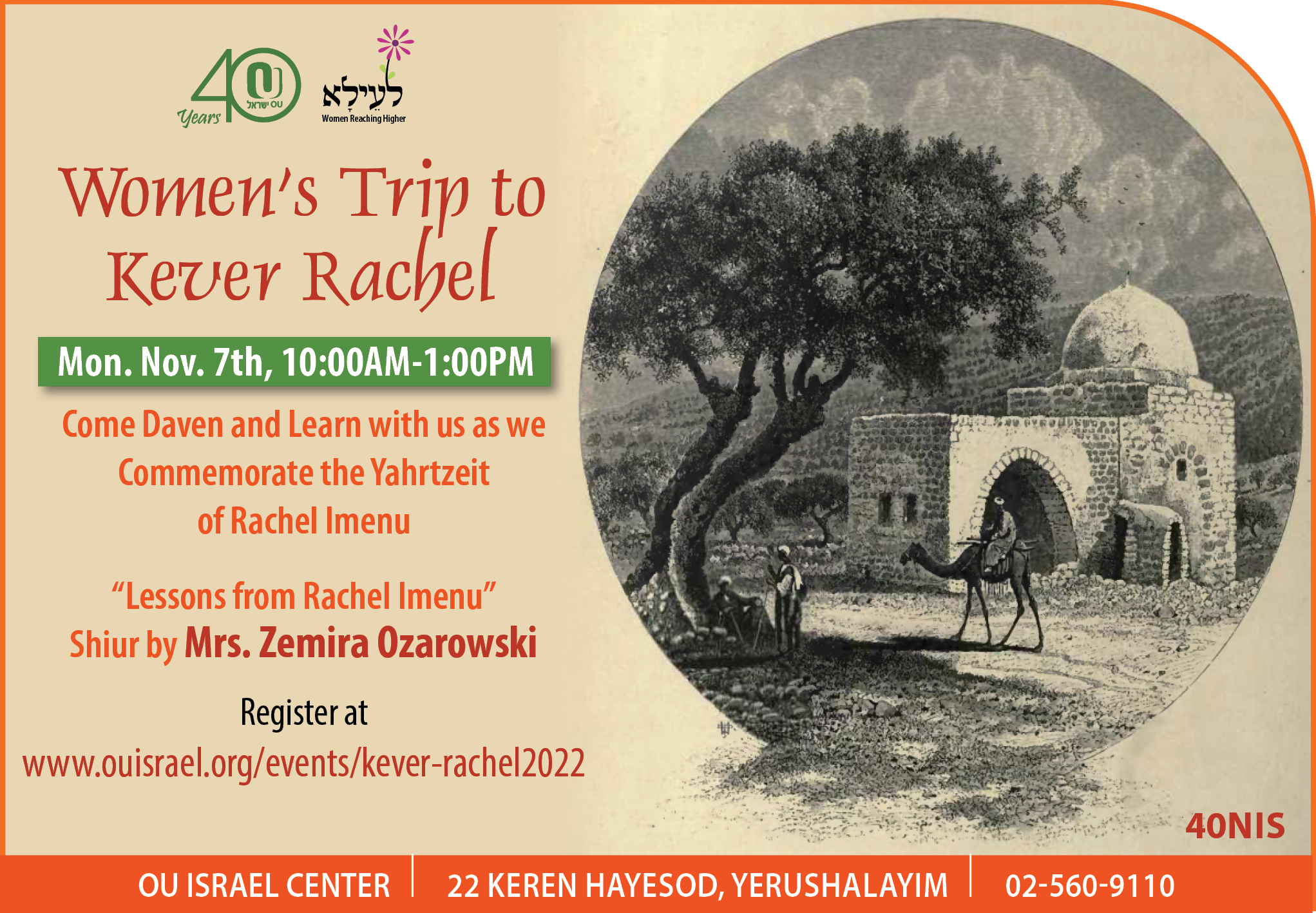 The bus will leave the OU Israel center (22 Keren hayesod) at 10am and will return to the center by 1pm. Make sure you register for this inspirational trip!