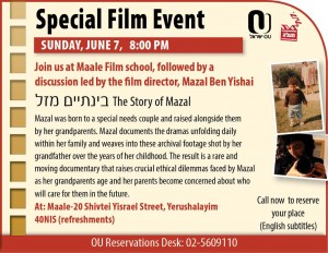 Mazal Ben Yishai, the film’s director, was born to a special needs couple and raised alongside them by her grandparents. Camera in hand, Mazal documents the nuanced dramas unfolding daily within her family and weaves into these archival footage shot by her grandfather over the years of her childhood. The result is a rare and moving documentary that raises crucial social and political questions about the impossible ethical dilemmas faced by Mazal as her grandparents age and her parents become concerned about who will care for them in the future.