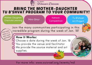 This program currently runs simultaneously in 6 communities and we are now ready to offer it to additional communities. The program takes place six times a year, before each chag, and is geared for girls ages 9-12 and their mothers. It allows them to bond through Torah learning and art, in preparation for the upcoming holiday.