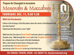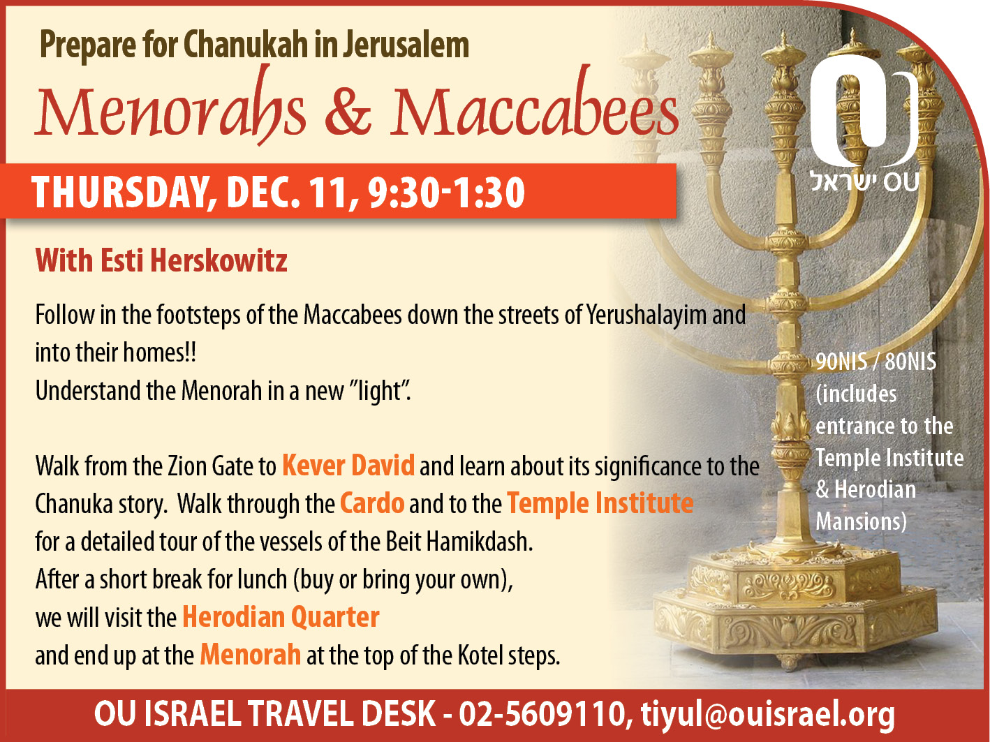 Walk from the Zion Gate to Kever David and learn about their significance to the Chanuka story, walk through the Cardo and to the Temple Institute