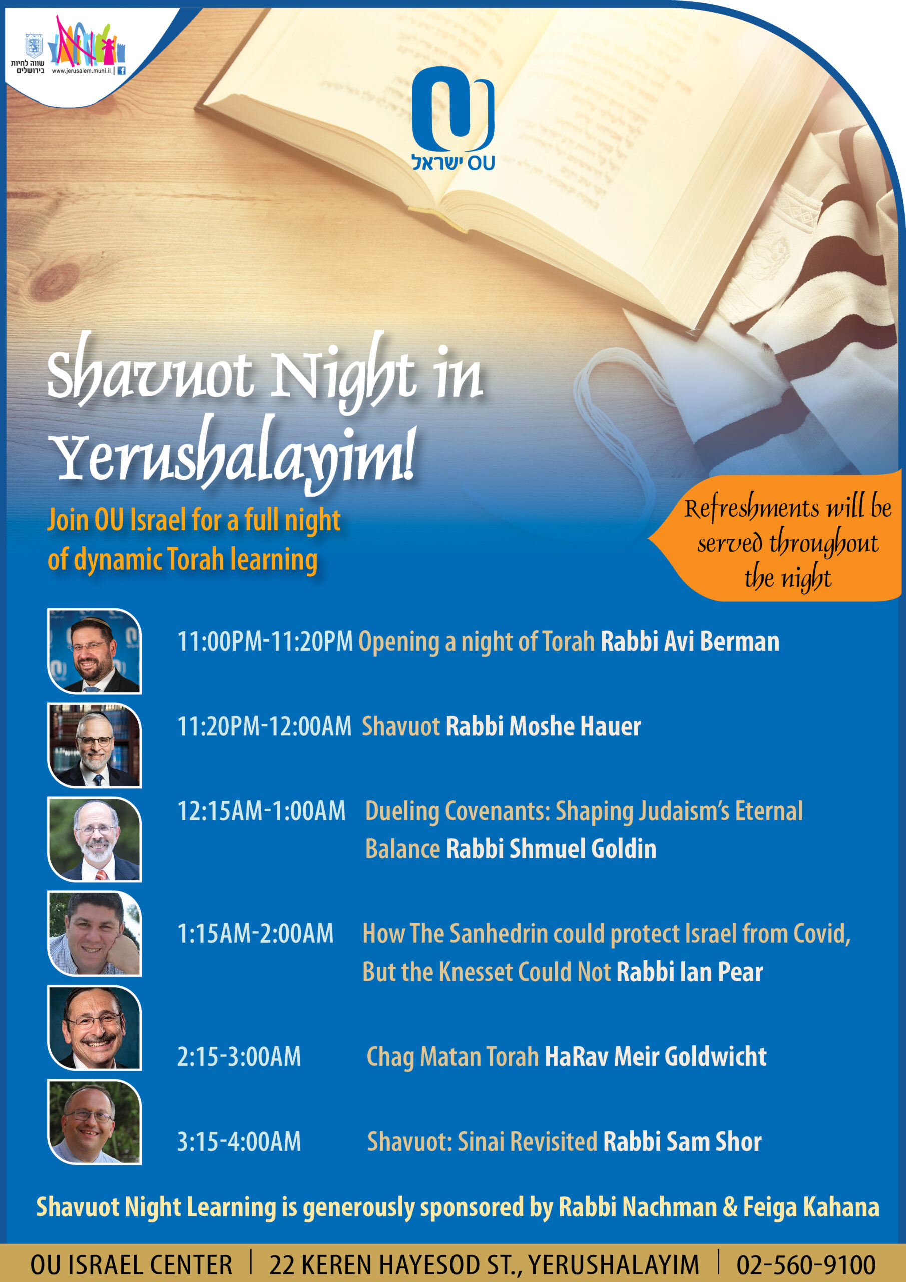 Shavuot Night Learning is generously sponsored by Rabbi Nachman and Feiga Kahana