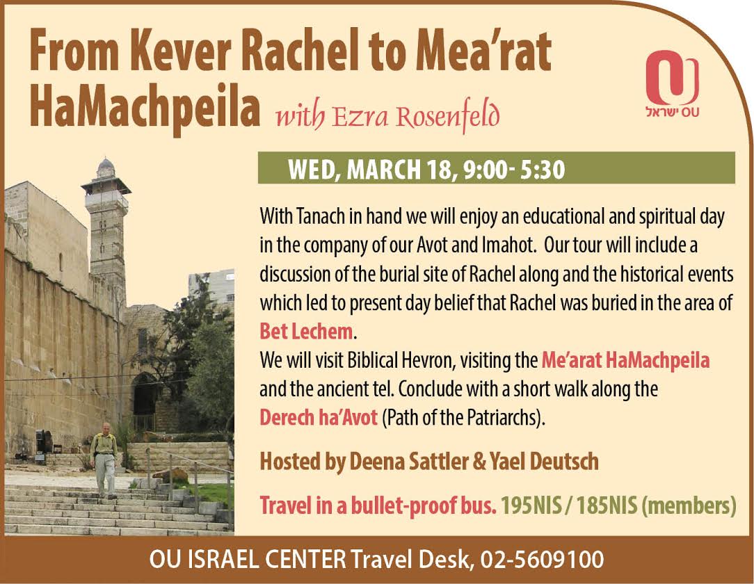 With Tanach in hand we will enjoy an educational, edifying and spiritual day in the company of our Avot and Imahot. Our tour will include a detailed discussion of the locale of the burial site of Rachel along with an understanding of the historical events which led to present day belief that Rachel was buried in the area of Bet Lechem.