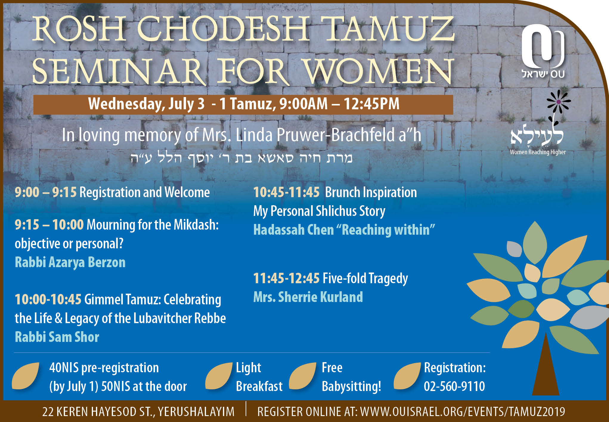 – 40nis advanced registration (by July 1 )/ 50nis at the door or online beginning July 2