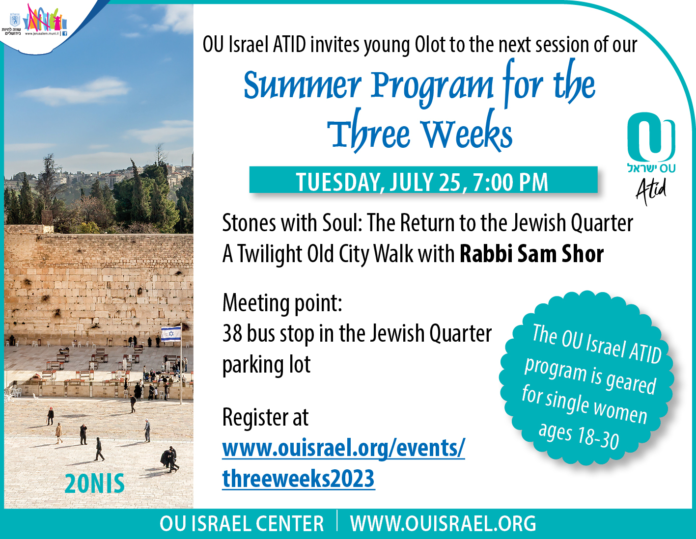 We are pleased to invite young Olot ages 18-30 to a special inspirational program for the Three Weeks. It will consist of programming for three consecutive Wednesday evenings at the OU Israel center and the last one, a Tuesday-night Tiyul of the Old City. The next event on the program is our final event, a special evening tour of the Jewish Quarter with Rabbi Sam Shor.