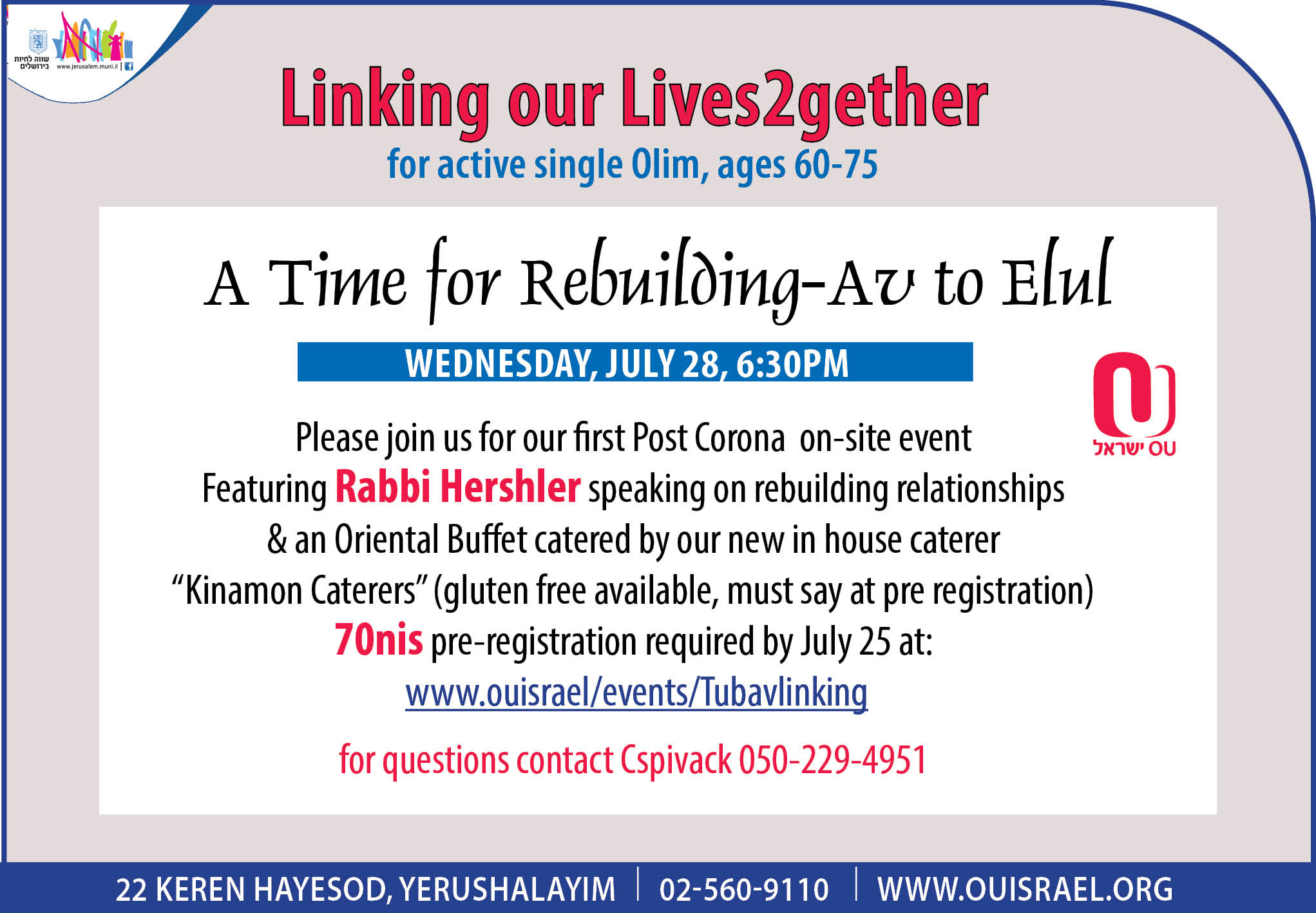 70nis pre-registration required by July 25 at www.ouisrael/events/ Tubavlinking
