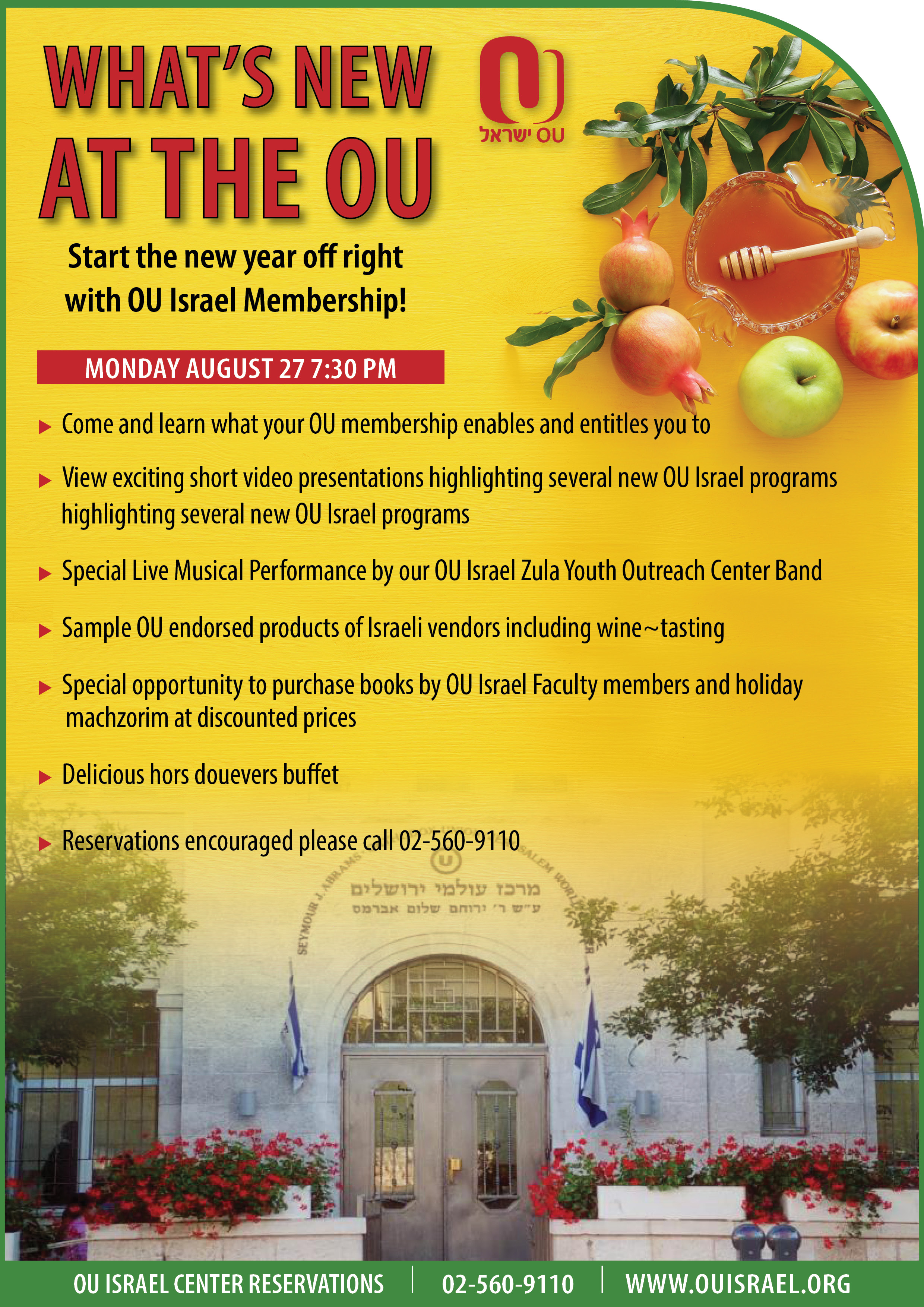 This is the time of year for new beginnings and here at the OU Israel Center we are gearing up for a new year of activities. It is also the time of our Membership campaign. We want to invite you to learn about the many services the OU Israel provides to the Anglo community and beyond. Please come and experience what is new at the OU. Monday August 27, 7:30pm.