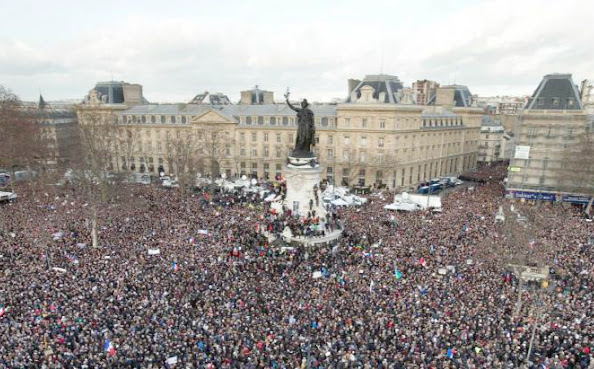 Thousands of people gather at Republique square in Paris, France, Sunday, Jan. 11, 2015. Thousands of people began filling Franceís iconic Republique plaza, and world leaders converged on Paris in a rally of defiance and sorrow on Sunday to honor the 17 victims of three days of bloodshed that left France on alert for more violence. (AP Photo/Peter Dejong)