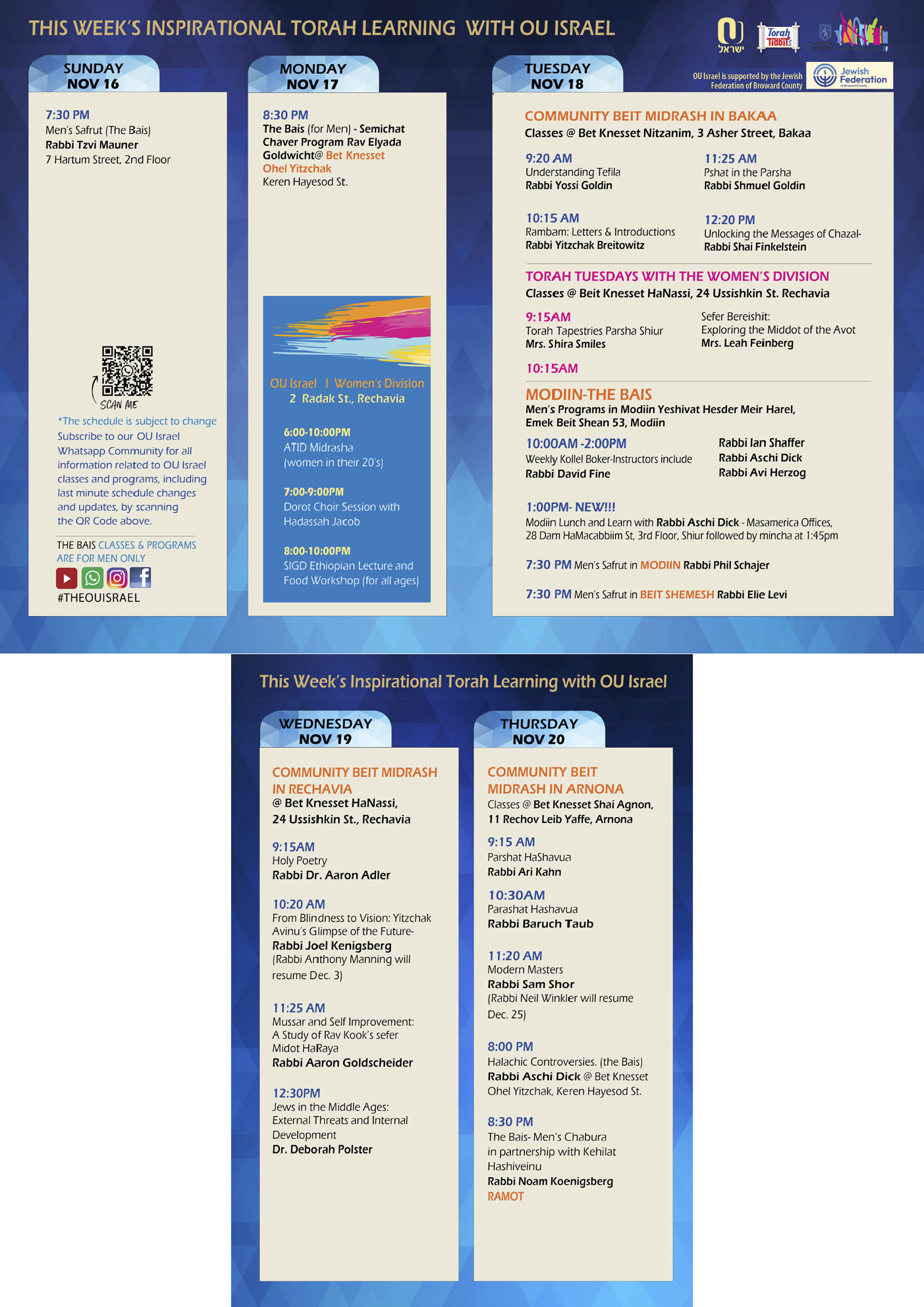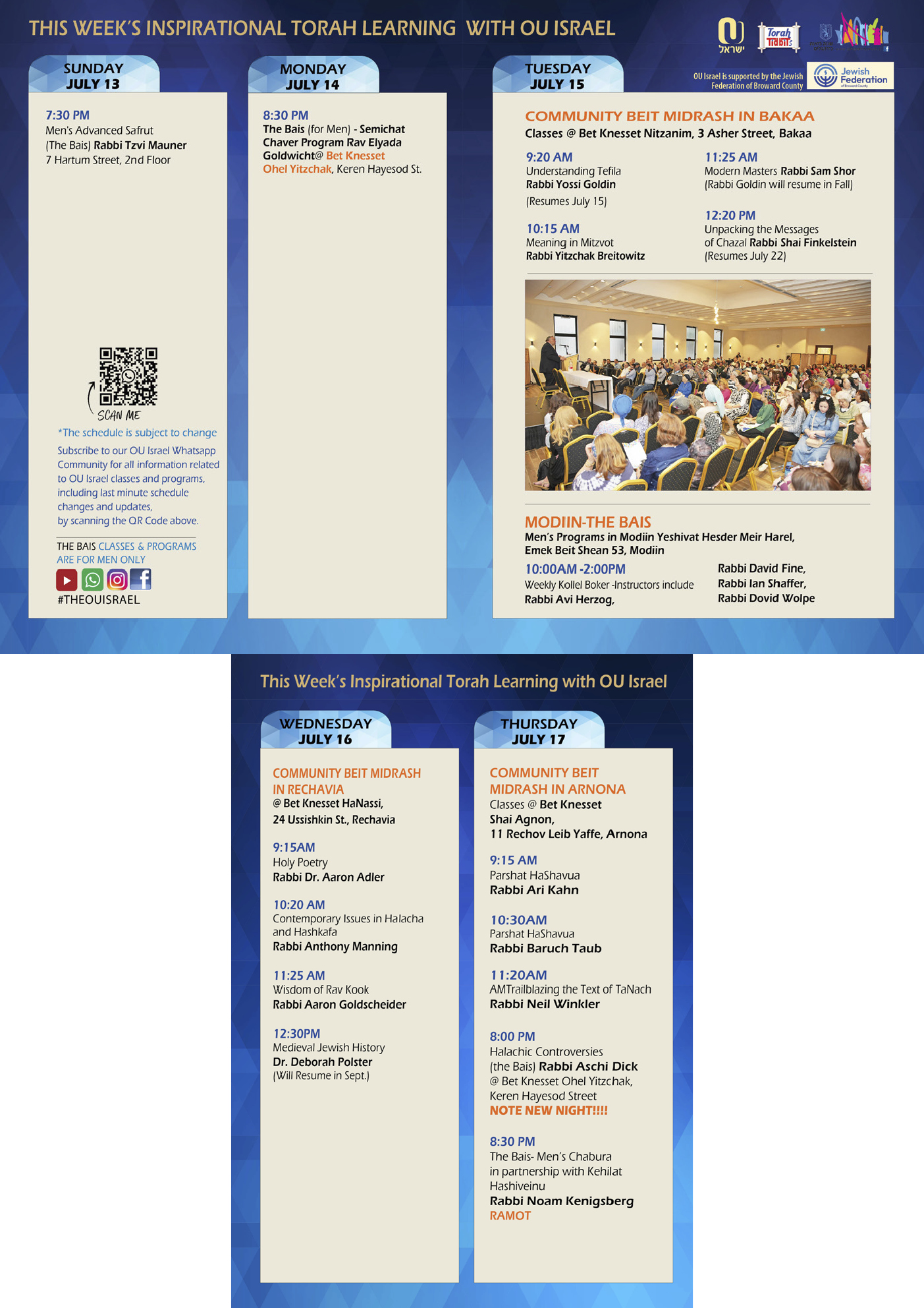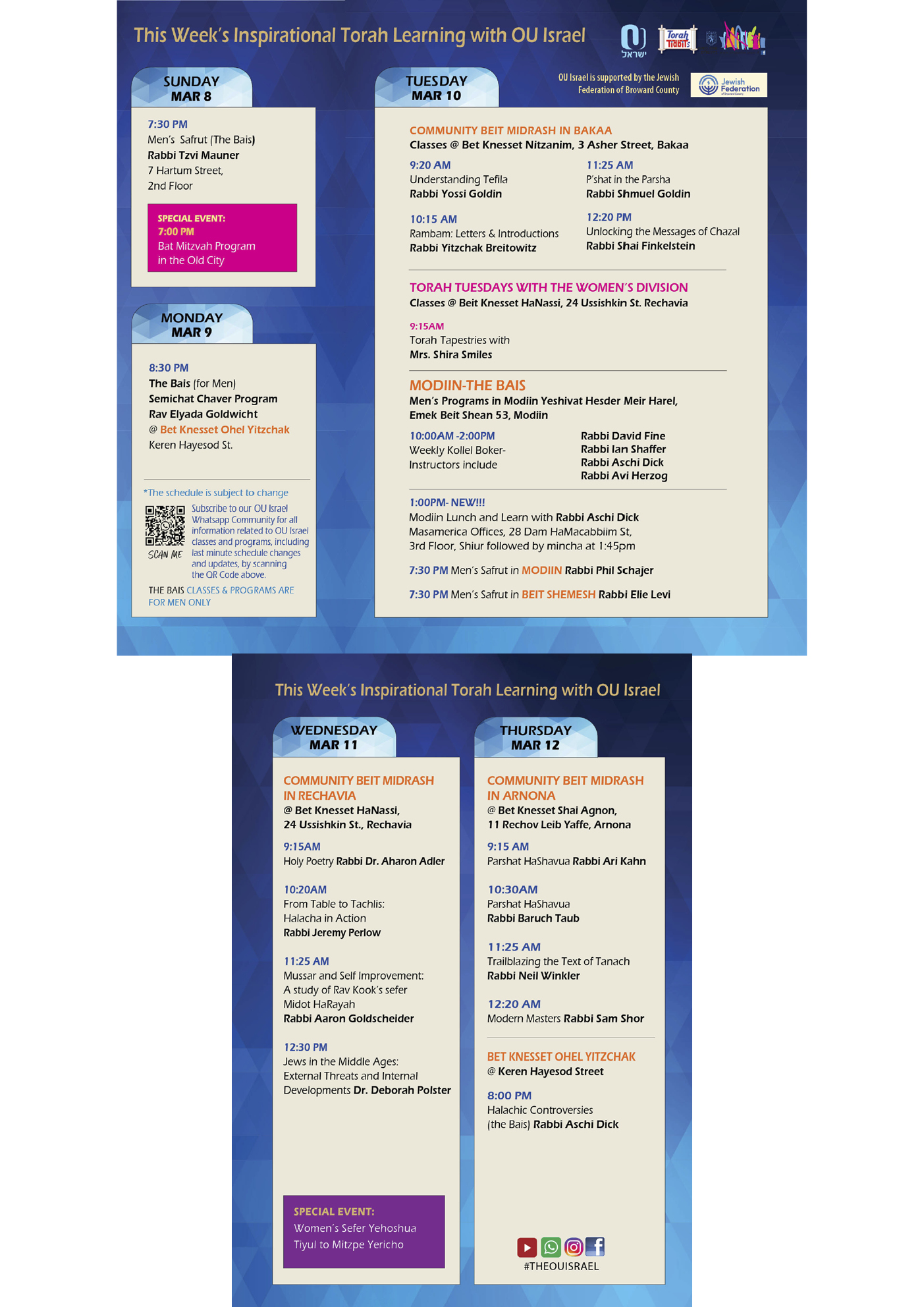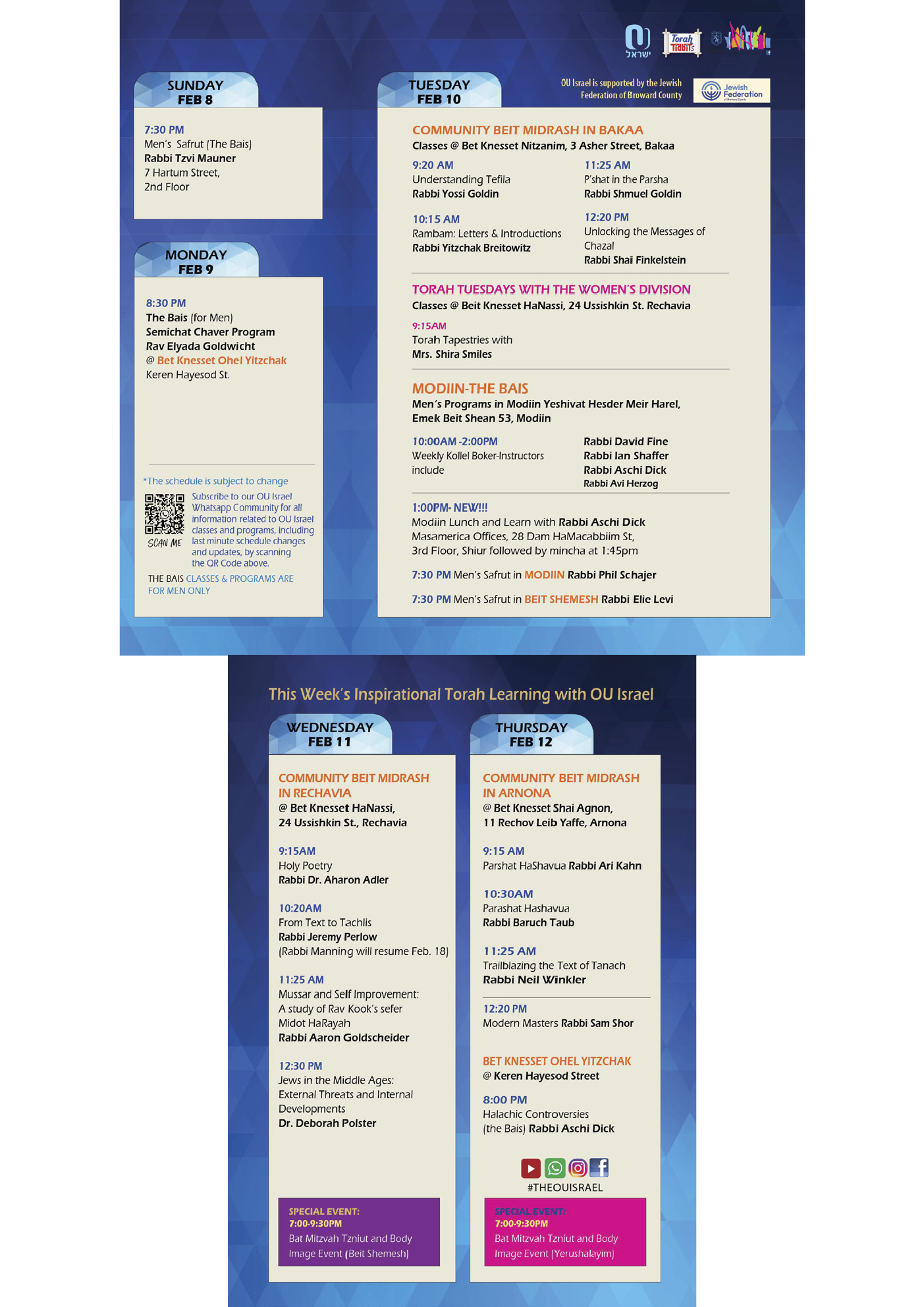 Since 1979, The OU Israel Center has provided a warm and welcoming environment, spiritual inspiration, and social connection for English-speaking Olim (new immigrants) and tourists – from young professionals to families to active retirees. Our 5 story, 840 sqm building in central Yerushalayim, complete with lecture halls, an English language library, classrooms, and event halls, is home to more than 80 weekly programs.