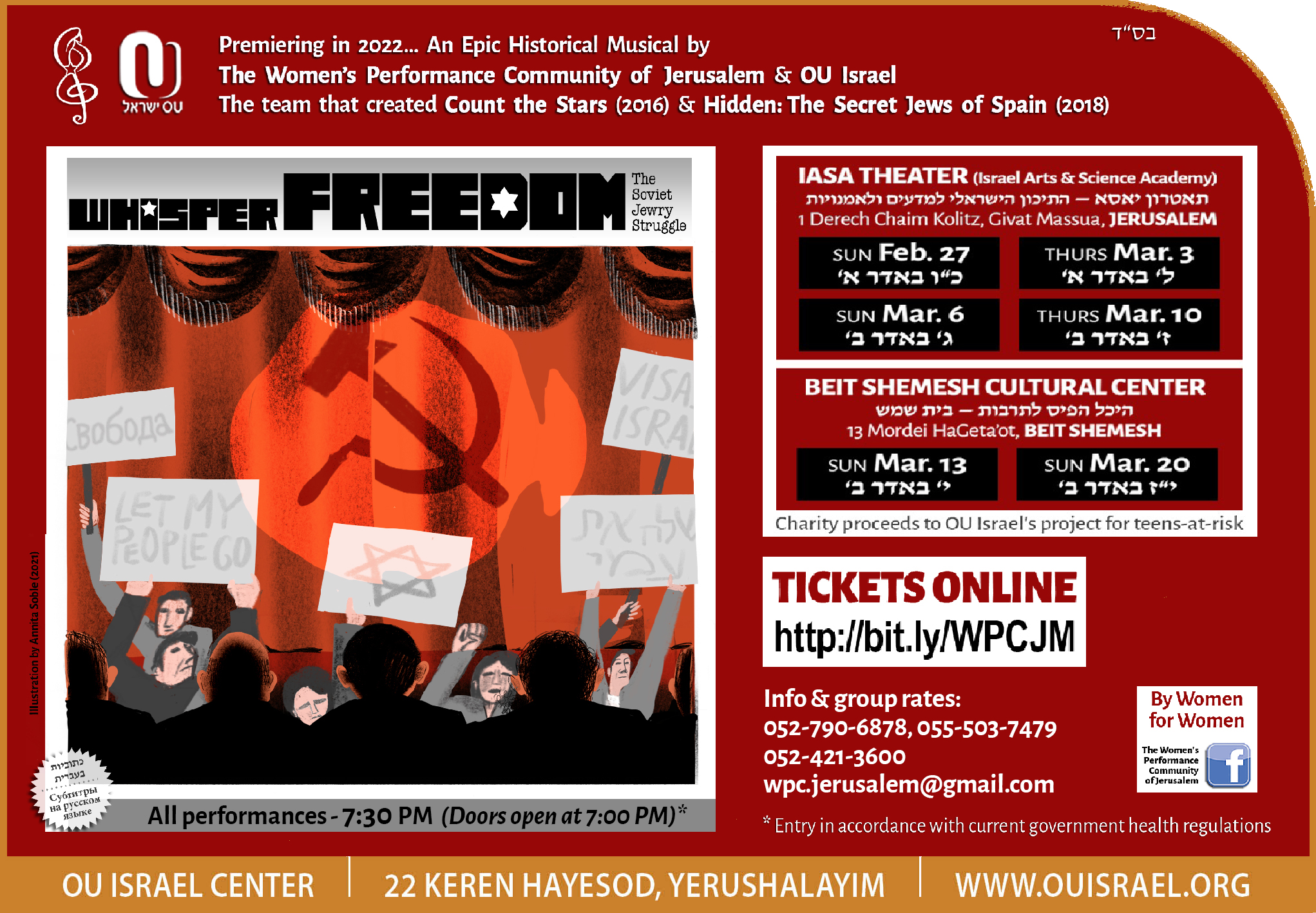 Help support The Women’s Performance Community of Jerusalem in their goal to pass the story of Soviet Jewry and the Jews around the world who fought for them down to the next generation in an exciting engaging way. Donate: https://www.ouisrael.org/whisper-freedom-the-struggle-of-soviet-jewry/